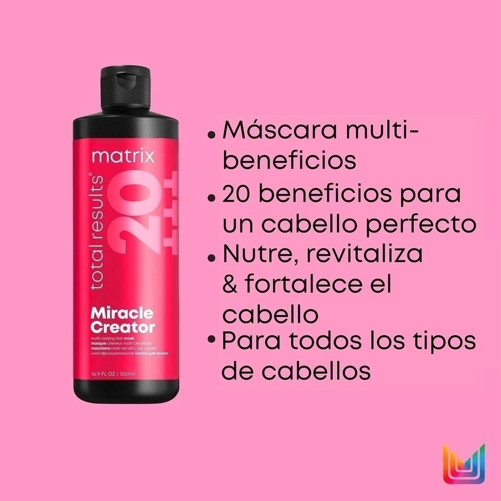 ¡Máscara profesional para mantener tu cabello perfecto en casa, hasta tu próxima visita al salón!Matrix Total Results ha creado la mascarilla capilar de tratamiento multi-beneficios Miracle Creator profesional para reparar el cabello dañado. Esta revolucionaria fórmula rosada de un solo uso, nutre, revitaliza y fortalece el cabello en sólo 60 segundos. Se puede usar en todos los tipos de cabello.